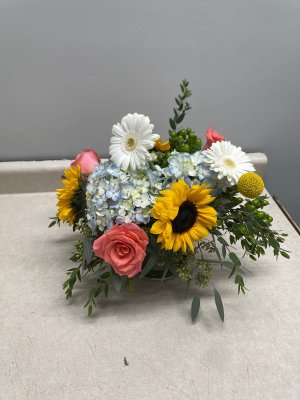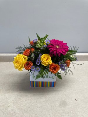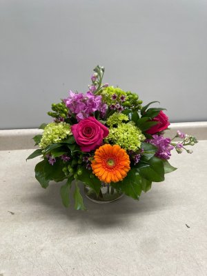 The arrangement is beautiful. Bright colors, huge blooms, fresh and cheerful. The vase will be reused over and over for my ten grandchildren. Thanks. The photo is an excellent marketing idea, by the way.