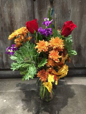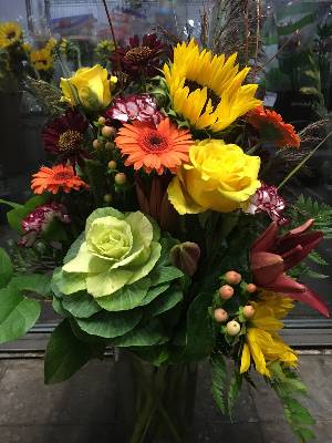 Wonderful arrangement that really lights up the space with vivid fall colors.Your work,as always,is appreciated.