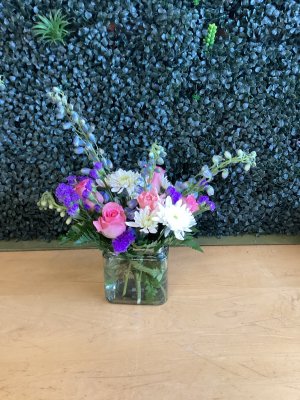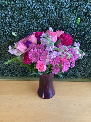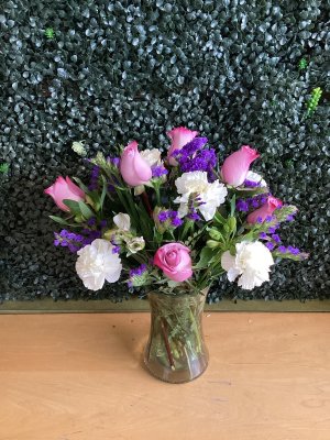Many of the purple flowers were broken and the entire bouquet was sparse appearing. I was grateful for the surprise but disappointed by the flowers themselves. The purchaser noticed them over the phone they were not even close to what she purchased. The nicest part of the delivery was the delivery person.