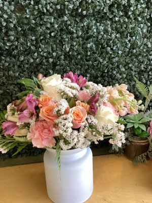 Unfortunately, I was very disappointed with the quality of the design and the flowers in it. I don't know what my 2 children paid for it but it was for a very difficult day. That was my wedding anniversary and if my husband hadn't died 19 years earlier we would have been married for 48 years. We found out by accident that he was in the last stages of lung cancer and had 1 to 2 months to live. He had no symptoms but unfortunately the Dr's were right. He died at 2am on New Year's day. It still feels like yesterday. It was very hard on my children and on me. I lost everything. My home, possessions, car money. Doing a foreclosure and bankruptcy was no fun. My children grew up in the Naperville school system and my daughter now teaches there. I needed to move and a m now in a rental in Oswego. There is a florist in downtown Oswego that is very creative and whose flowers. She just got flowers from there from her husband and kid's for Mother's day. Her husband is Ryan Kauffman the president of Oswego. I don't remember the name and theybare in Vegas at some political thing so I can't get the name for you but Oswego is a small village.When my son called the next day he asked.if there were any peach flowers in the display. I had to go look as when they were delivered by a wonderful delivery gentleman truly wonderful everything looked white. There were some tiny carnations who's tips looked like they might be peach. I went to look at them and luckily they had opened a bit more and I could tell him yes. Peach was my wedding color. Bridesmaid dresses, flowers etc so I'm sure whoever ordered these flowers for me asked that some peach flowers be put in the display. Wish I could give you a better rating but it was what it was. I appreciated that my children thought of me 19 years since we lost him and know how difficult this day would be for me and for themselves. I don't know where this picture wasn't done by me. My flowers didn't look like that.