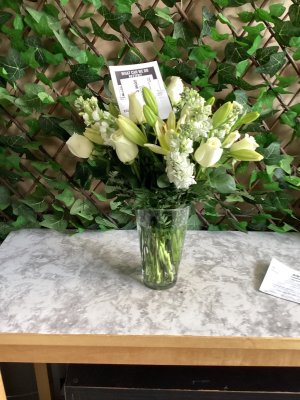 The flowers are beautiful. A gorgeous arrangement . Flowers are fresh and still look great.