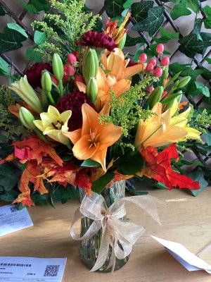 A beautiful fall themed arrangement that warms my my home at a sad moment in my life.