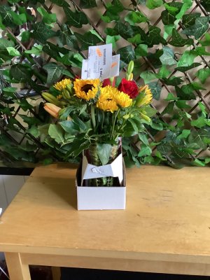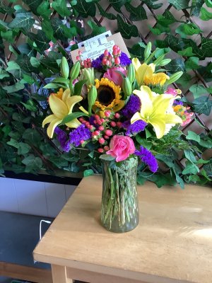 "flowers are Beautiful! I appreciate the phone call that i had a delivery because they thought i would not t see it bc we come in from the back!"
