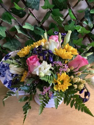 The flower arrangement is beautiful and it surely brightened my day. It has a nice cup & saucer keepsake as well that I will enjoy for a long time.