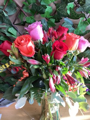 Driver delivery person was fabulous. Kept great communication and came back to deliver. Disappointed no ribbon around vase, no flower food packet, should have had a plastic covering over to protrct in the elements. The message on the card was not correct. Had a bunch of question marks instead of hearts. Same thing happened at sweetest day. Flowers were ok. Not the best. It's the thought that counts. .