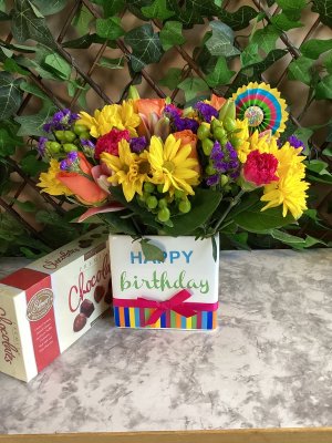 Beautiful spring flowers. Were a gift for my birthday. Lovely arrangement with bright, spring colors and a gorgeous vase and festive balloon. Thoughtfully left at my neighbor's when I wasn't home and they called and also texted to make sure I knew where they had left them. Great service!