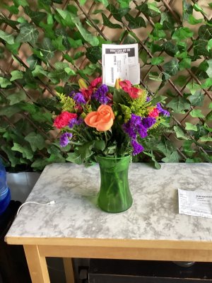 The flowers are beautiful. A gorgeous arrangement . Flowers are fresh and still look great.